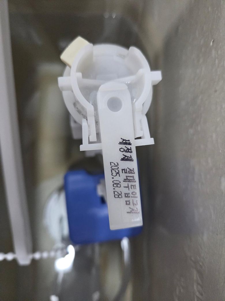 양변기 물탱크 일체형 입니다.하얀색 부품 필벨브 위쪽에는 물이 없어야 할거 같은되 물이 고여 있네요?부품 바꾸고 나서 물내려가고 다시 물이 찰때 물소리가 달라서 열어보고 보게 됬습니다.