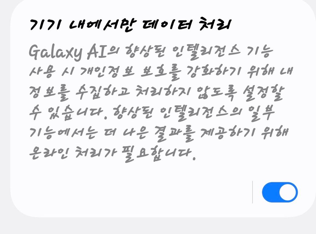 삼성전자 서비스 안내를 보면 나오는 내용인데요. 사용자가 보안을 위해 '기기 내에서만 데이터 처리'를 활성화해두면 서버를 사용하는 기능이 차단되기 때 문에 이를 해제하라는 설정 창이 뜨는 거죠. 자연스러운 현상입니다.