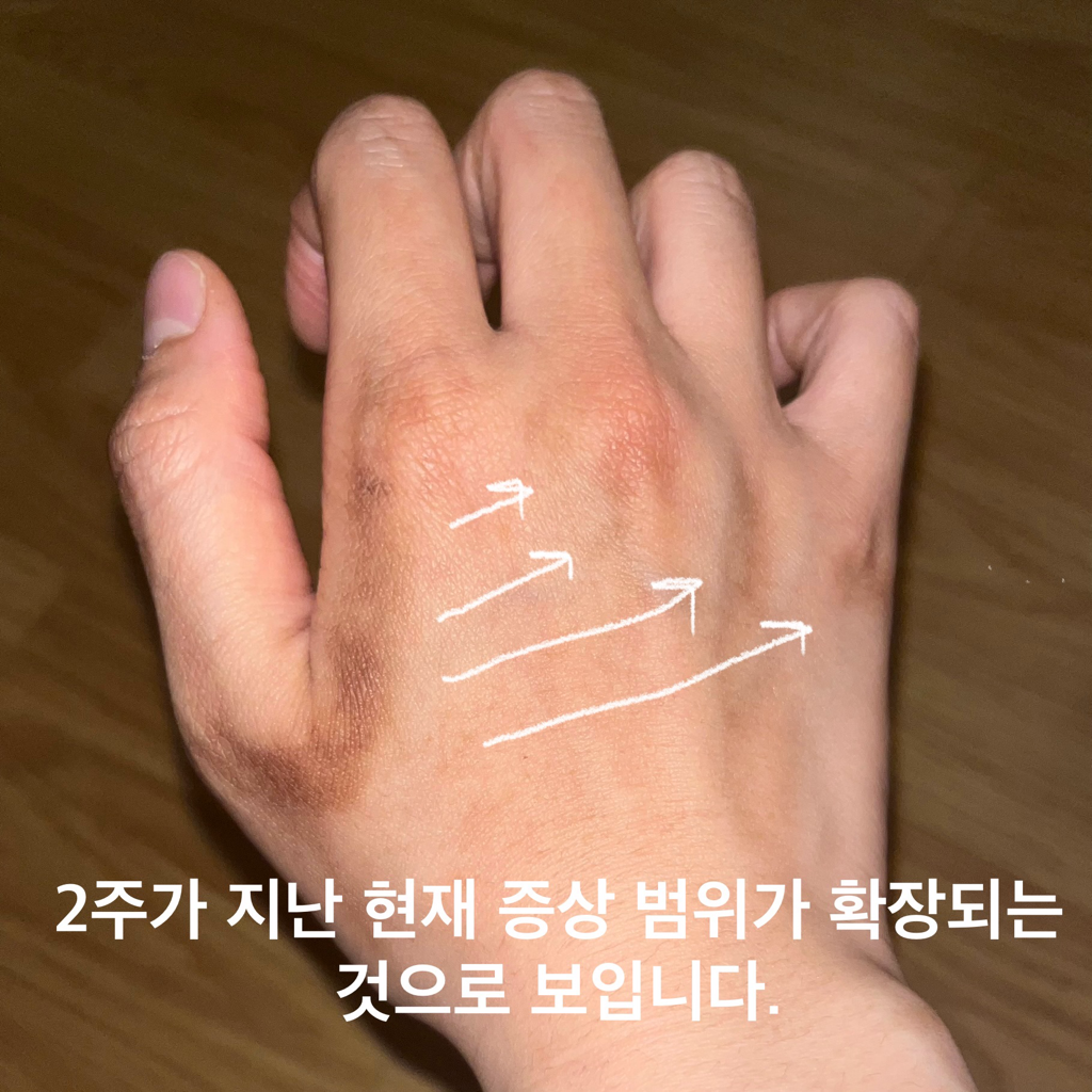 2주 후 현재는 색이 진해지고 범위가 확장되었습니다.