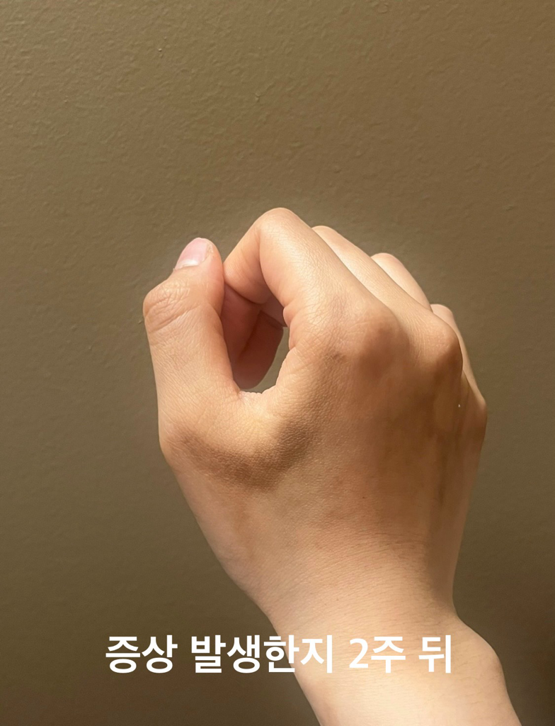 지금은 손을 쓰면 저 부위가 저리거나 찌릿하고 주먹을 쥐고 있으면 아프고 손을 다 펴야 통증이 덜 합니다.