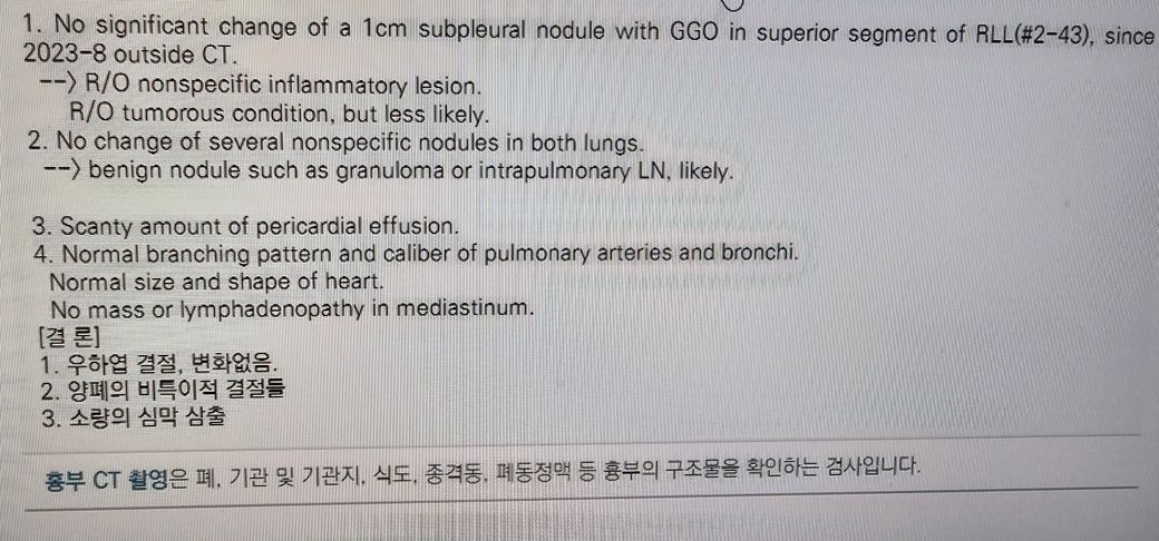 오른쪽 하엽에 1cm 크기의 결절이 있으며, 2023년 8월 외부 CT와 비교했을 때 유의미한 변화가 없다고 합니다. 이는 종양이나 염증성 병변 가능성을 배제해야 하지만, 현재로서는 악성의 가능성이 낮다고 볼 수 있습니다.