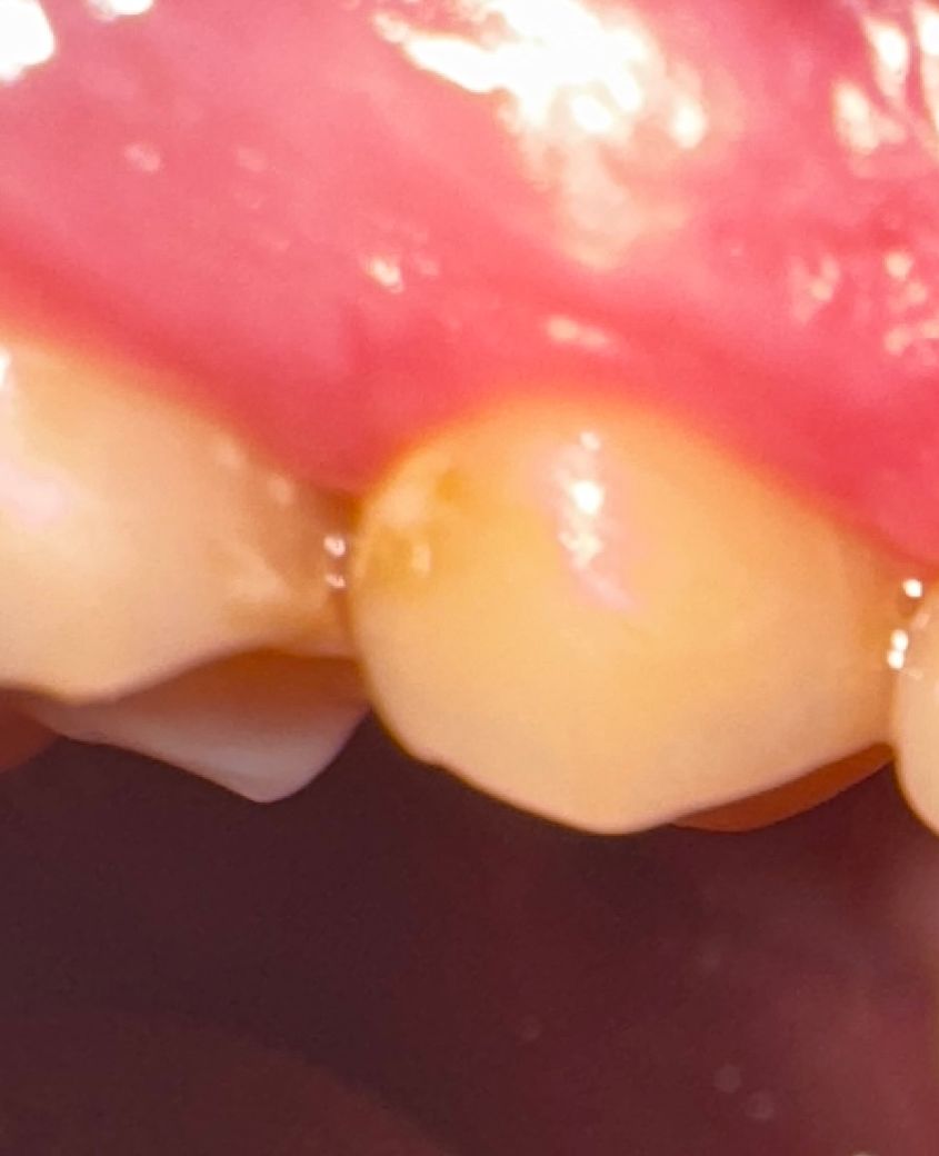 현재 사진상 충치또는 착색이 의심이 됩니다. 충치는 초기에 빠르게 치료를 받는 것이 중요하기에 치과에방문하여 현재 상태를 확인하고 치료를 받길 권합니다.