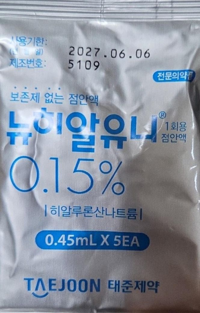 말씀주신 점안액은 인공 눈물입니다. 사진의 제품은 히알루론산나트륨 0.15% 성분의 점안액으로, 일반적으로 인공눈물과 동일 계열(윤활제)입니다. 보존제가 없는 1회용 제형이라면 건성안에서 인공눈물처럼 사용하는 것은 원칙적으로 가능합니다.