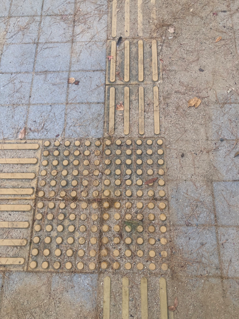 인도를 보면 자전거 통행길하고 사람이 걷는 길을 분리해 놯는데 사람이 걷는 거리 보면 노락색으로 별도 표시되어 있는게 있는데 뭔가요? 그리고 긴 모양하고 동그라미 모형 뭐가 다른건가요?