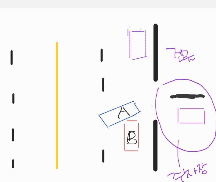 B차량은 정차 중 이였고 A차량은 정차 중이던 B 차량을 확인 후에 추월하여 진행을 하려다가 정차 중이던 차량이 출발하여