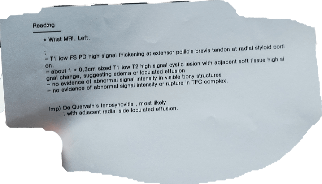 원래 알고 계신대로 손목건초염으로 진단 되었으며 그 외 별다른 코멘트는 없어 보입니다.