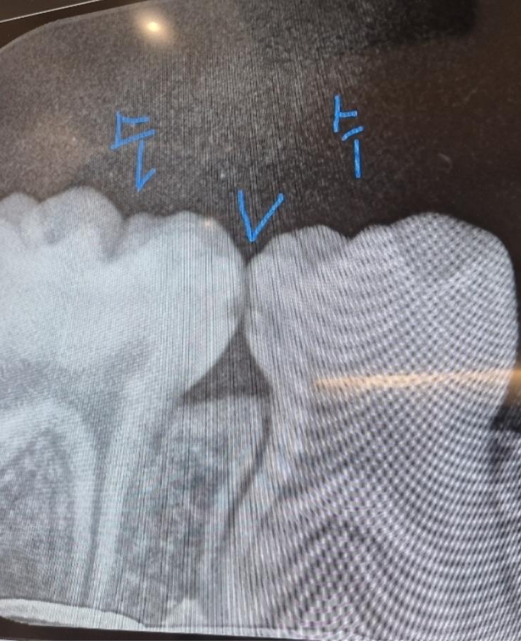 또한 방사선 사진상 보이는 옆면 충치는 비교적 빠르게 충치가 진행되기도 하고, 그쪽으로 계속 음식물이 껴서 관리가 더 어렵기도 합니다.