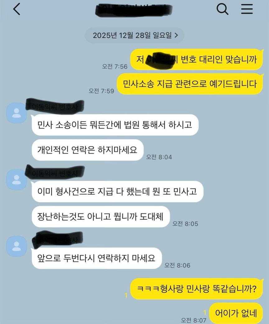 다름이 아니라 제가 민사소송중에 지금은 끝난사건이지만 그때만 생각하면 당한거 같아서 적어봅니다 이사진으로 변호사 법?위반으로 고소가 가능할지 알려주세요 다만 상대방이 돈갚는다 할때마다 연락도 피했었고 자기가 갚는날마다 연락이 안되서 어쩔수 없이 상대방 부모님측에게 사정사정하면서 연락을드렸어요 또한 제가 예기할때마다 차단박으시고 연락도안되서 제이름까고 제지인들폰으로 사정사정하게예기하면서 사과도드리면서 예기했습니다 다만 이사진을 보시면 상대방어머니가 상대방의 변호대리인 번호를 주었고 자기자신은 빠져나간상태였고 어머니가 연락처주신번호로 연락햇더니 자기는 상대방의 민사소송대리인이라면서 저를 비아냥하거나 신고하려면 해라 이런식으로 협박을했습니다 근데 알려준 민사소송대리인에게 이름과 소속을 물어봤으나 왜물어보냐고 하며 말을피했으며 정작 소송할땐 답변서만 냈으며 증거하나 내지도 않았고 조정기일에도 사유없이 2회불출석했고 그뒤변론기일이잡혔으나 상대방대리인은 사유도 없이 2회불출석 한상태였습니다 이경우도 변호사 사칭으로 신고가 가능할까요? 단 상대방어머니의 경우 상대방의 민사 고소장 등등 수령한거봤습니다 다만 민사소송기록을보면 피고 XXX 변호인 이라는 표시도없었고 피고 XXX이라고만 적혀있었어요이경우 피고인의 어머니 피고인의 법적대리인을 신고 가능한가요?