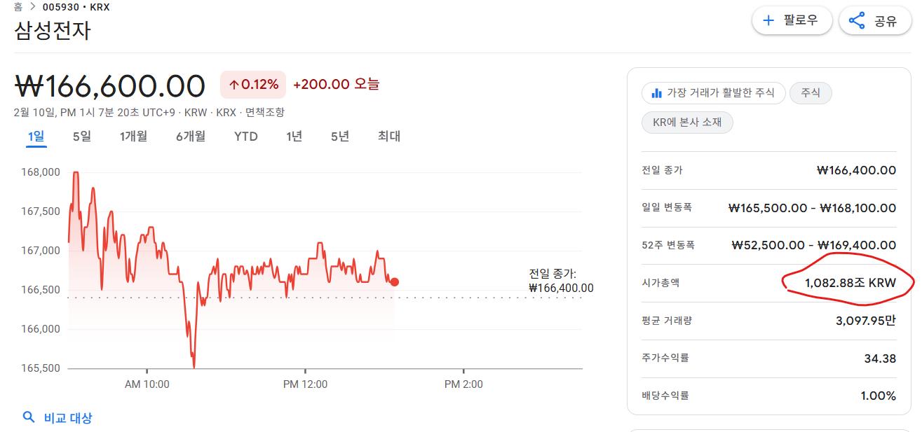 현재 삼성전자 주가는 166400원 이고 시가총액은 약 985조 입니다 얼마전에 우리나라 주식 최초로 시가총액 1000억을 달성 했다가 지금은 주가가 조금 하락해서 조정 중이네요