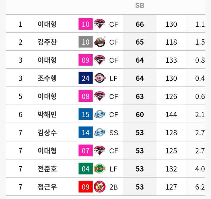 2000년 이후 KBO 프로야구에서 한 시즌 가장 많은 도루를 기록한 선수는 2006년 LG 트윈스의 이대형으로 64도루를 기록했습니다. 이종범의 1994년 84도루 이후 60개 이상의 도루를 기록한 선수는 이대형이 유일합니다.