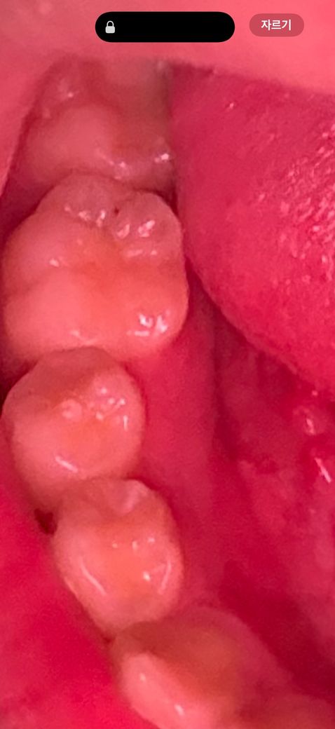 사진에 보이는건 치과에 가셔서 검진을 받아보셔야될것같습니다. 음식물이 껴잇을수도 잇고 초기 충치일 가능성도 있습니다.