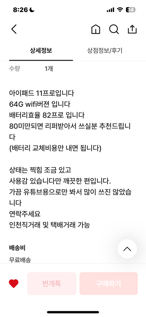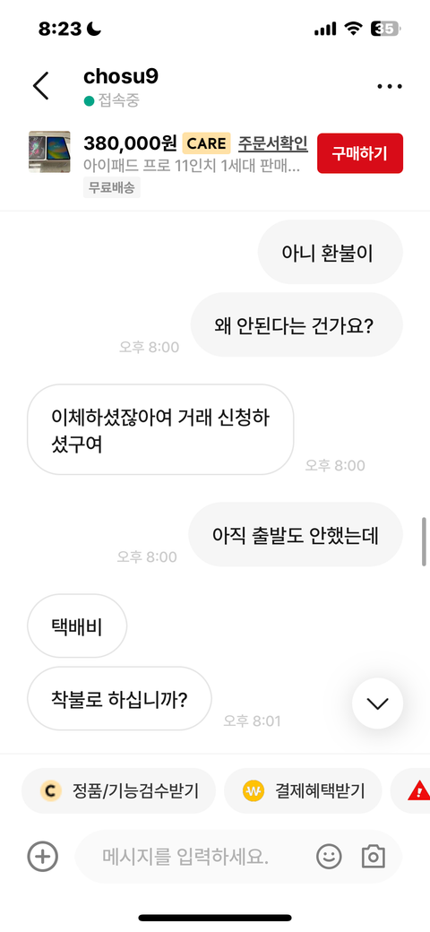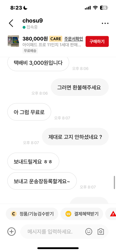 번개장터 아이패드 구매후 단순변심 환불