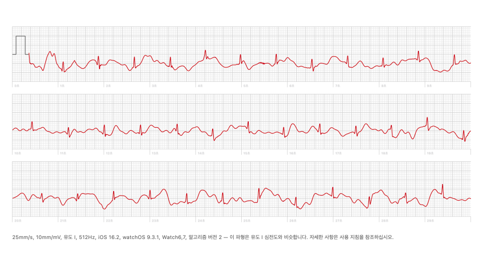 애플워치와 같은 웨어러블 디바이스로 시행한 심전도의 경우, 리듬 외에는 정확한 판독에 제한이 있고 베이스라인이 많이 흔들린 심전도이나, 저명한 이상소견은 없어보입니다.