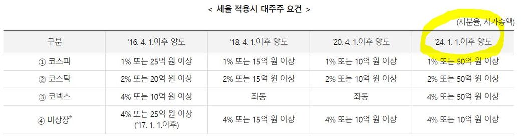 1. 밑에 사진을 보면 대주주 요건이 24.1.1. 이후 양도한 주식에 대해서는 코스피 1% 코스닥 2% 코넥스 4% 라고 되어 있는데요, 예를 들어 제가 코스피에 상장된 어떤 주식을 샀다면 그 특정 주식의 발행주식 총 수의 1% 이상을 가질 때 대주주가 되는 건가요? 코스피에 상장된 모든 종목 발행주식의 지분율 1%를 말하는 것이 아닌거죠?