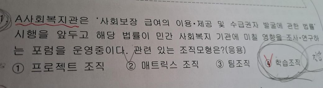 문제의 정답은 1번 프로젝트 조직입니다. 이 기관은 새로운 과제인 법률 시행에 따른 영향 분석을 수행하기 위해 일시적이고 목적 중심적인 활동을 하고 있는 상황인데요. 특정과제를 수행하기 위해 한시적으로 구성된 조직이며 과제가 끝나면 해산되는 조직인 프로젝트 조직이 정답입니다. 체크를 해두신 2번 매트릭스 조직은 기능별 조직과 프로젝트 조직이 혼합된 형태로 복잡한 과제에 유연하게 대응이 가능하고요. 정답이라고 하신 4번 학습조직은 지속적인 학습과 혁신을 통해 변화에 적응하는 조직이며 장기적 발전에 초점을 맞추고 있습니다. 즉 학습조직은 장기적인 조직 문화나 역량 강화에 초점을 두고 있기 때문에 이 문제의 맥락과는 거리가 멀다고 하겠습니다. 문제의 핵심 상황인 법률 시행에 따른 영향 분석을 위한 포럼 운영에는 1번 프로젝트 조직이 정답입니다.