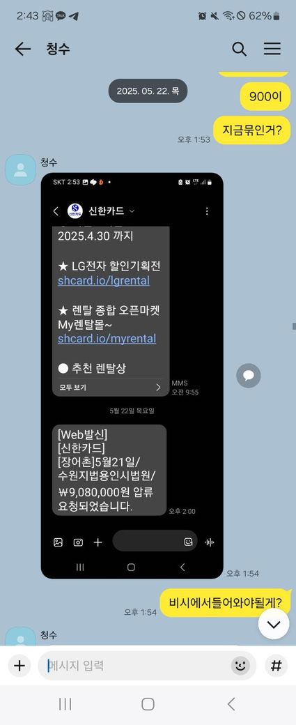 그리고 문자로 신한카드에서 21일 압류예정 이렇게나오고 수원지법용인시법원 이렇게 나오는데 이게 맞는 이야기인가요??