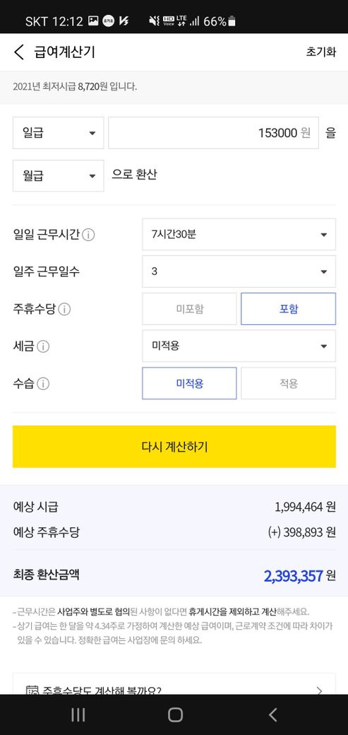 아르바이트 근로계약 재작성 하려는데 제가 산출한 금액이 맞는지요?