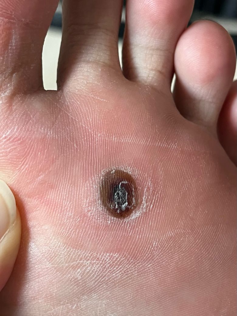 냉동치료 후 일반적으로 1주에서 3주 사이에 수포나 딱지가 형성되고 탈락하지만, 발바닥 사마귀는 각질층이 매우 두꺼워 이 과정이 지연되거나 딱지 형태 없이 검게 괴사된 조직이 그대로 남아 있는 경우가 흔합니다. 사진에서 보이는 중심부의 검은색은 피가 고인 혈종이라기보다는, 냉동치료로 손상된 사마귀 조직과 혈관이 괴사되면서 색이 어두워진 소견에 더 가깝습니다. 주변 피부에 심한 발적, 열감, 고름이 보이지 않는 점도 감염 가능성은 낮아 보입니다.
