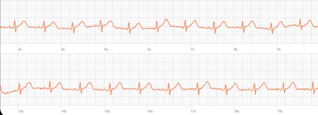 스마트기기의 심전도 소견을 통해서 유의미한 의학적인 결론을 내릴 수는 없지만, 심장도 규칙적으로 뛰고 리듬도 매우 정상적인 것이 이상이 있어 보이지 않습니다.