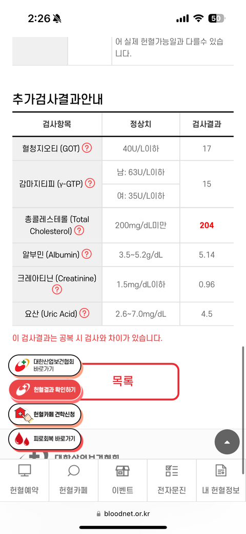 최근에 헌혈을 했는데 콜레스테롤 수치가 정상범위를 넘어서서 걱정돼서 질문드립니다. 177에 64kg, 25세 남자이고 사진처럼 콜레스테롤 수치가 정상범위를 넘어서서 질문드립니다. 콜레스테롤에 관한 지식이 없어서그런데 단 거를 많이 먹으면 수치가 올라가는걸까요..? 많아 높은 편인건가요? 다른 수치들은 범위보다 한참 낮은데 콜레스테롤은 다른 여유있는 범위들에 비해 높게나와서 걱정이네요. 공복으로 검사를 안하긴했는데 공복상태에서 제대로 검사해봐야할까요?