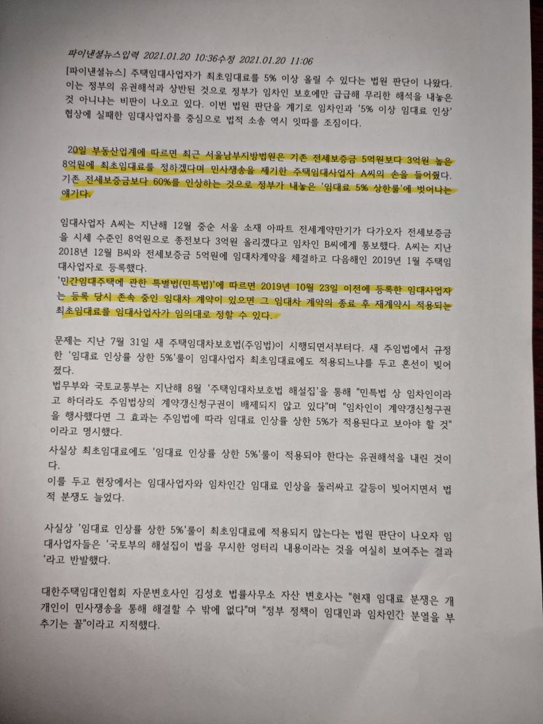 질문하신 내용에 대하여 아래와 같이 답변 드립니다.위 사안을 민간임대사업에 관한 법률과 주택임대차 보호법의 상충에 따라 나온 판결로 보여지며 해당 사업자가 2019년 10월 23일 이전에 등록한 임대 사업자인 경우에는 위와 같은 주장을 할 여지는 있을 수도 있으나, 이에 대해서 1심의 판결 내용만으로는 단정하기 어렵고 구체적으로 검토를 해보야야 할 사안으로 임차인 입장에서는 계약갱신청구권의 행사 및 차임 증가 제한 5%의 주장을 해볼 여지는 있다고 보여집니다. 위의 증액 요구가 해악의 구체적인 고지라고 보기는 어려운 점에서 바로 협박이라고 판단하기는 어려울 수 있어 보입니다. 참조가 되길 바랍니다.