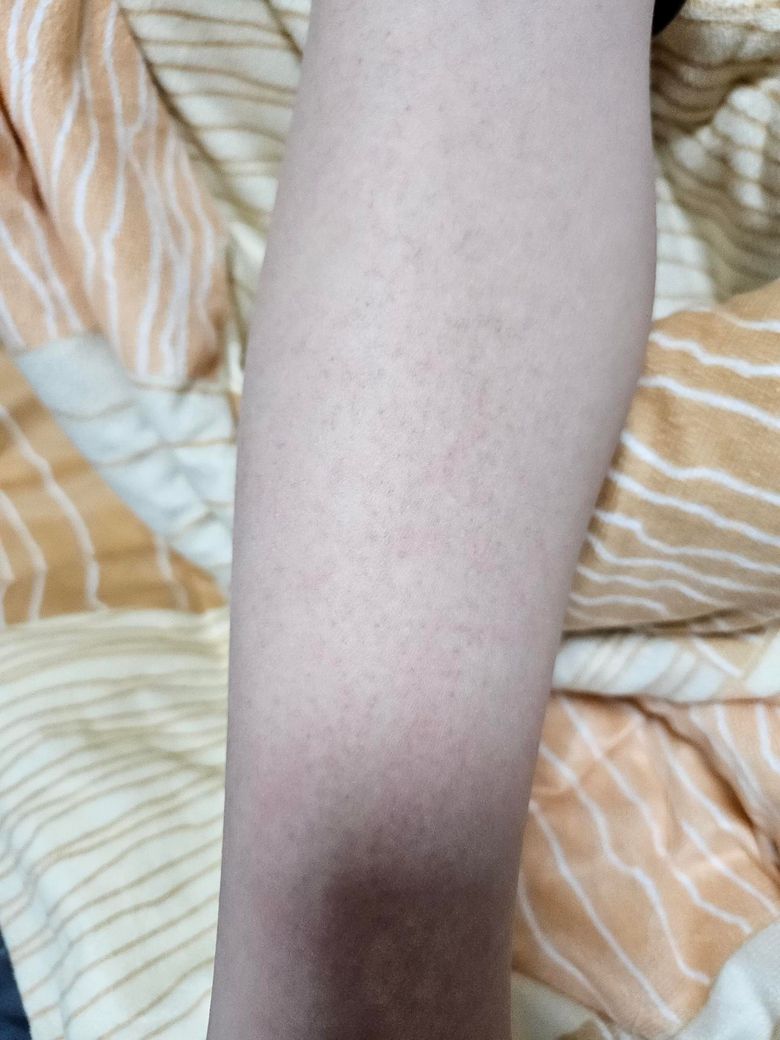 사진과 설명을 종합하면, 가장 가능성이 높은 것은 일시적인 혈관 반응성 발진입니다. 피부 표면은 매끈하고 만져지는 병변이 없으며, 종아리에 국한되고 전신 증상이나 발열이 없는 점이 특징적입니다. 최근 반복적인 발열과 임파선 비대가 있었던 점을 고려하면, 바이러스 감염 후 회복 과정에서 자율신경이나 말초혈관 반응이 불안정해지며 이런 옅은 붉은 반점이 나타날 수 있습니다. 이런 경우 피부 안쪽에서 얼룩처럼 보이고, 따뜻한 환경이나 혈류 변화에 따라 더 도드라지기도 합니다.