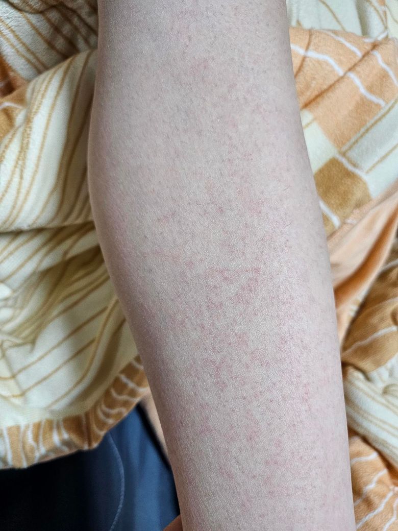 다음으로 흔한 원인은 건조에 의한 미세 혈관 확장입니다. 겨울철에 종아리 피부가 건조해지면 각질 없이도 피부가 옅게 붉어 보일 수 있고, 만졌을 때 거칠지 않고 매끈한 경우가 많습니다. 알레르기성 발진이나 두드러기라면 보통 가렵거나 만지면 도드라지는데, 현재 소견과는 다소 거리가 있습니다.