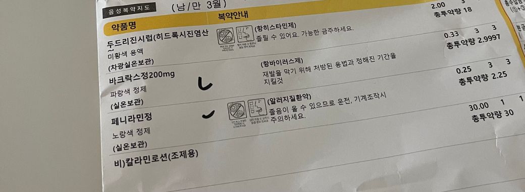 1. 항히스타민자에 바크락스정+페니라닌정 섞어 먹는데