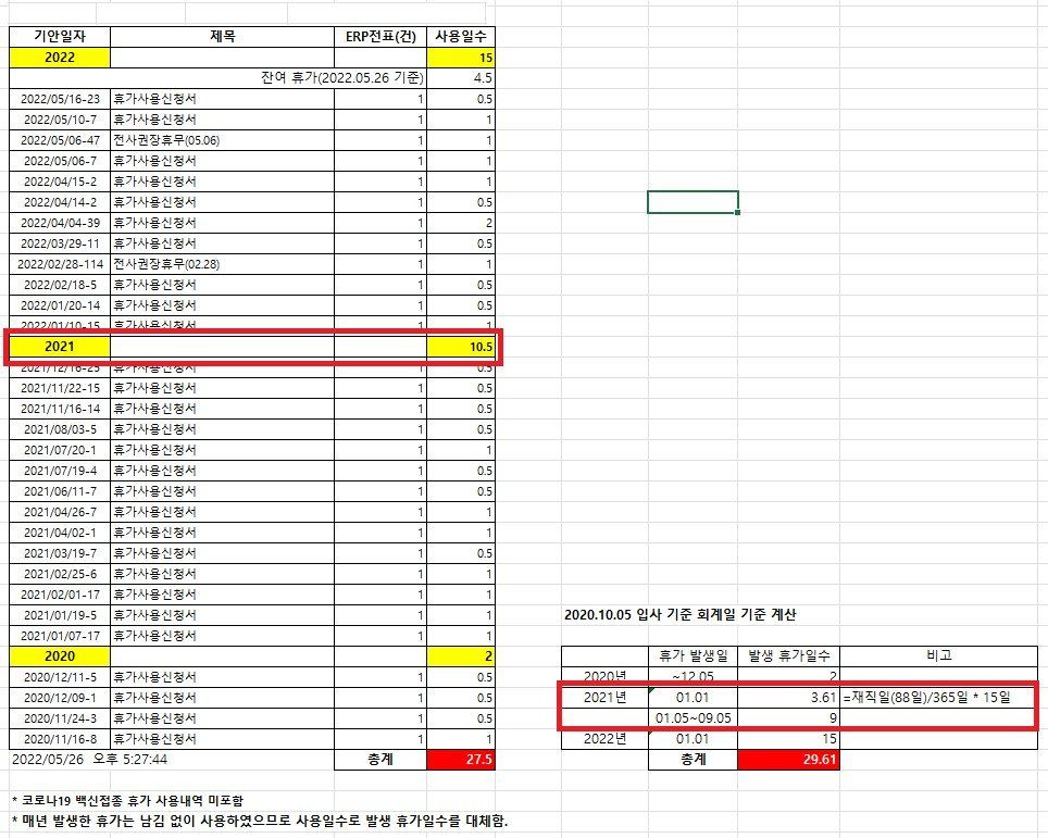 지금 회사에 재작년(2020년) 10월부터 근무를 시작했고, 곧 퇴사 예정이라 연차 지급 내역을 확인하고 있었습니다.