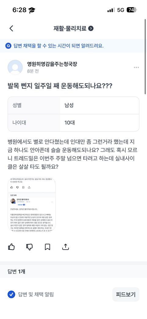 발목삔지일주일째 걷기는해도되나요?
