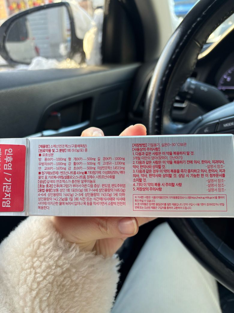 피임약 머시론을 복용 후 현재 휴약기 2일차 입니다. 목이 아파 약국에서 사진 속 약을 한 포 먹었습니다. 혹시 피임효과에 지장이 갈까요? 이중피임을 해야하나요?