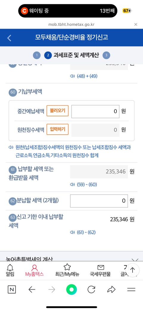 삼쩜삼 조회시에는 7000원정도 받는걸로 나오는데 홈택스에서 진행하니 아래 이미지처럼 20만원 가량 뱉어내야 한다고 나와서요.!