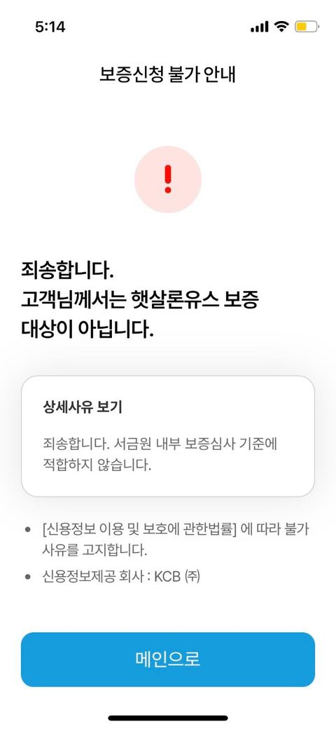 대출 심사조회시 보증신청 불가 안내 받을시(보증심사 기준에 적합하지 않습니다)