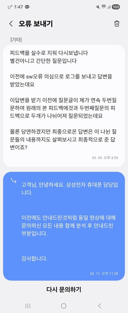 사진의 내용은 휴대폰에 어떠한 증상이 있어 문의한뒤 최종적으로 답변을 받은후