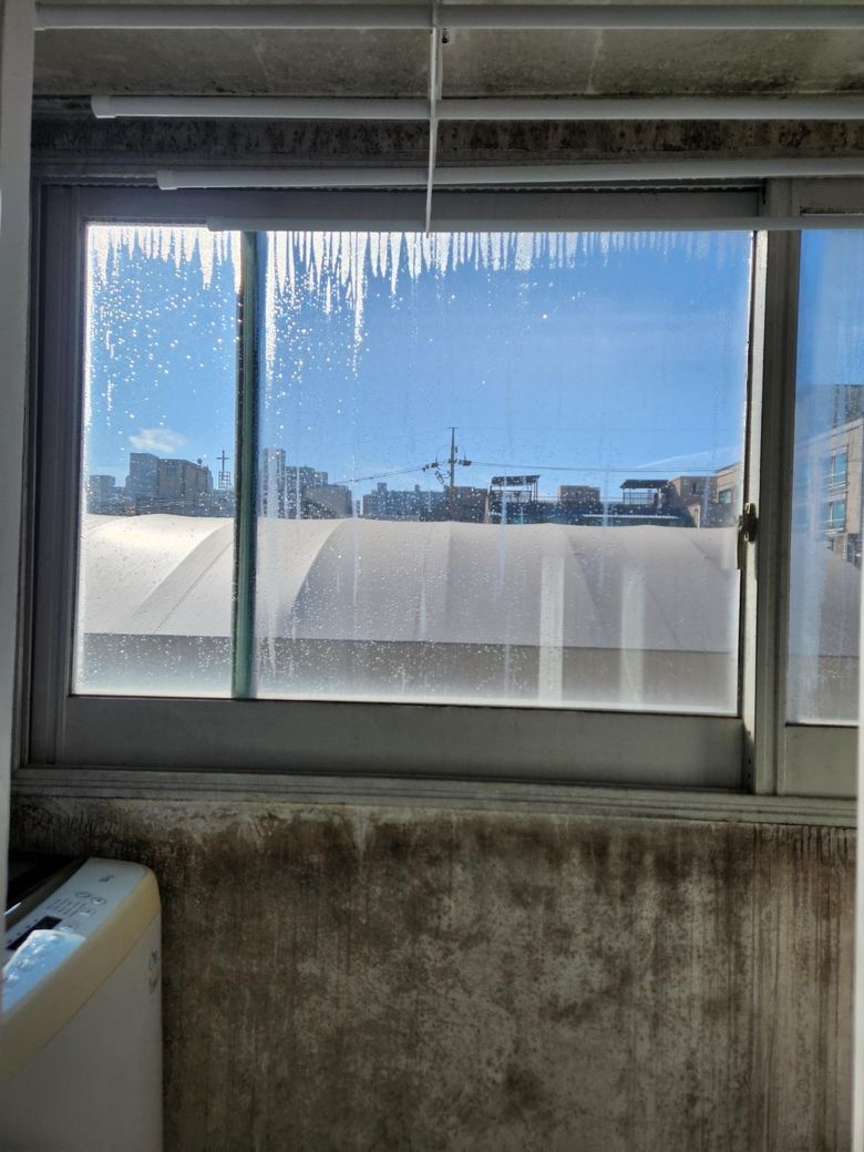사진에 보시는대로 창문에 습기가 맺혀 잇는것도 저는 결로? 등으로 건물이 문제가 있어서 생기는 습기다.