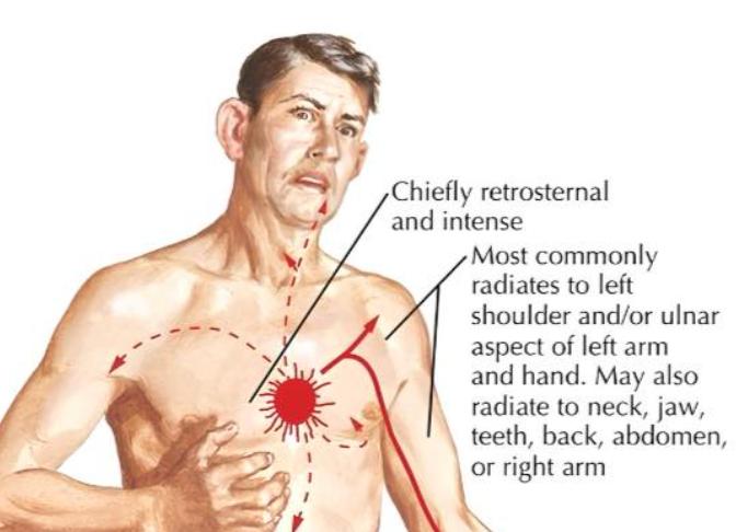 심장은 내장 기관이기 때문에 연관통증을 유발합니다. 때문에 좌측 흉부가 아니라도 좌측팔이나 어깨에도 통증이 유발될 수 있으며, 좌측 이빨에도 통증이 있을 수 있습니다.