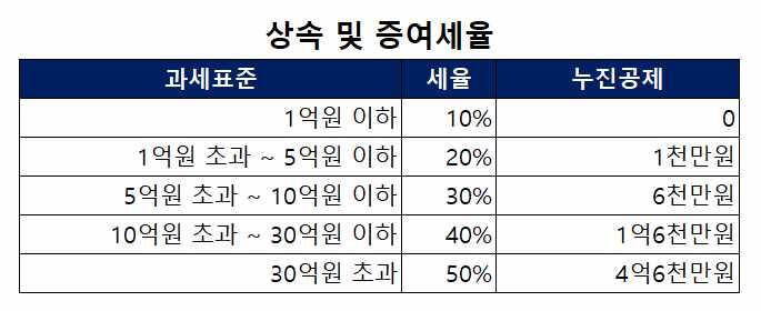 1. 상속세율과 증여세율은 10%~50%로 모두 동일합니다.