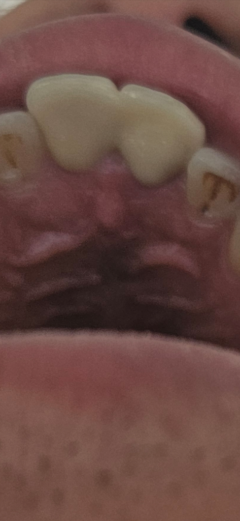 사진으로는 정확한 확인이 힘들어? 보이지만 설측으로 해서 충치에 있는 것으로 보입니다. 충치에 있는 경우에는 해당 부위의 충치를 제거하고 치과 용재료로 충전을 해줘야 될 수도 있습니다. 자세한 확인을 위해서 진료를 받아보세요