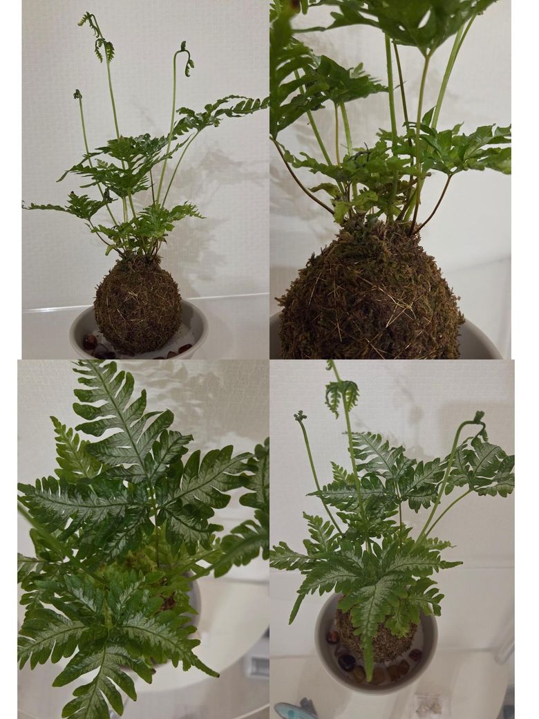밑동에 코코넛 섬유처럼 덮인 이끼 공 형태의 구형 화분 (이건 ‘코케다마’ 방식입니다)