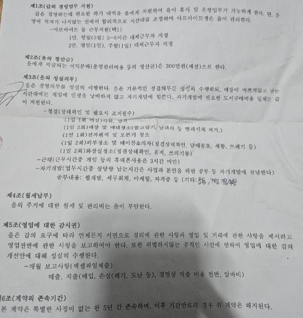 처음 본 동업계약서는 너무 친구(갑)에 유리한 조항만 보여서 이렇게 계약은 못한다고 했고 며칠 뒤 사업운영 계약서라며 새로운 양식을 가지고 왔습니다.