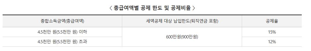총 급여 규모에 따른 한도와 적용 공제율은 아래와 같습니다.