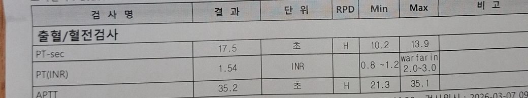 PT-sec 17.5초로 참고치 10.2에서 13.9보다 연장되어 있고, PT(INR) 1.54로 참고치 0.8에서 1.2보다 높습니다. APTT 35.2초로 참고치 상한 35.1초보다 약간 높습니다. 즉 혈액응고 시간이 정상보다 약간 길어진 상태입니다.