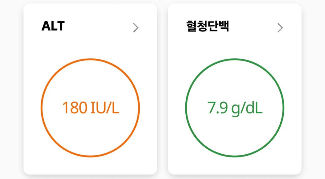 제시된 수치에서 ALT 180 IU/L는 정상 상한치(대개 40 IU/L 전후)의 약 4배 이상으로, 의미 있는 간세포 손상을 시사하는 상승입니다. 반면 혈청단백 7.9 g/dL는 정상 범위에 해당합니다.