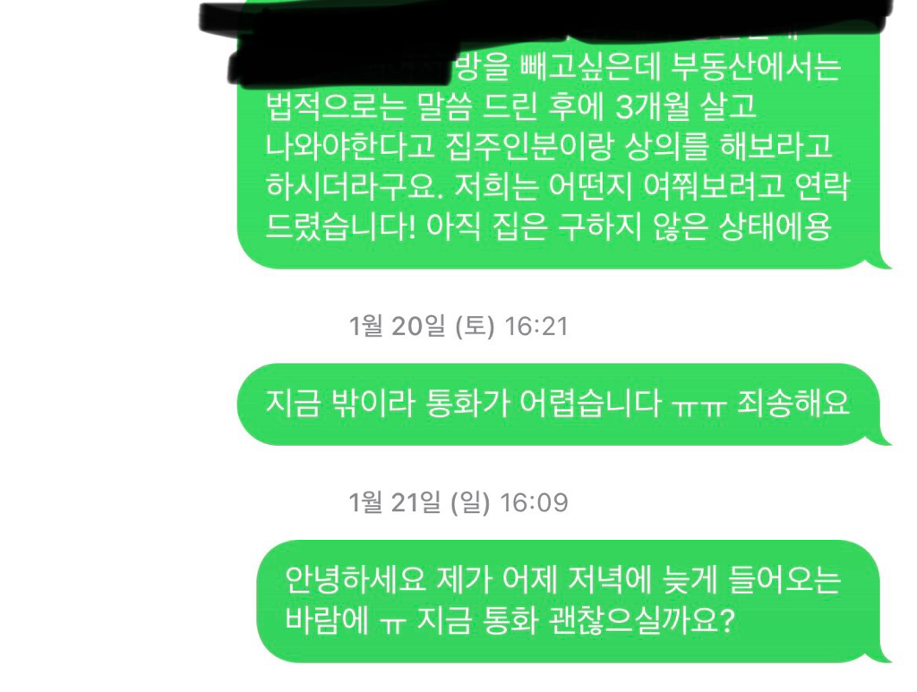 사진은 중도퇴실 입장을 문자로 먼저 말씀드린 것이고 전화로 의견을 나눈 뒤 세입자를 구하는 동안은 월세를 내라고 해서 동의하고 복비까지 부담하기로 한 것입니다.