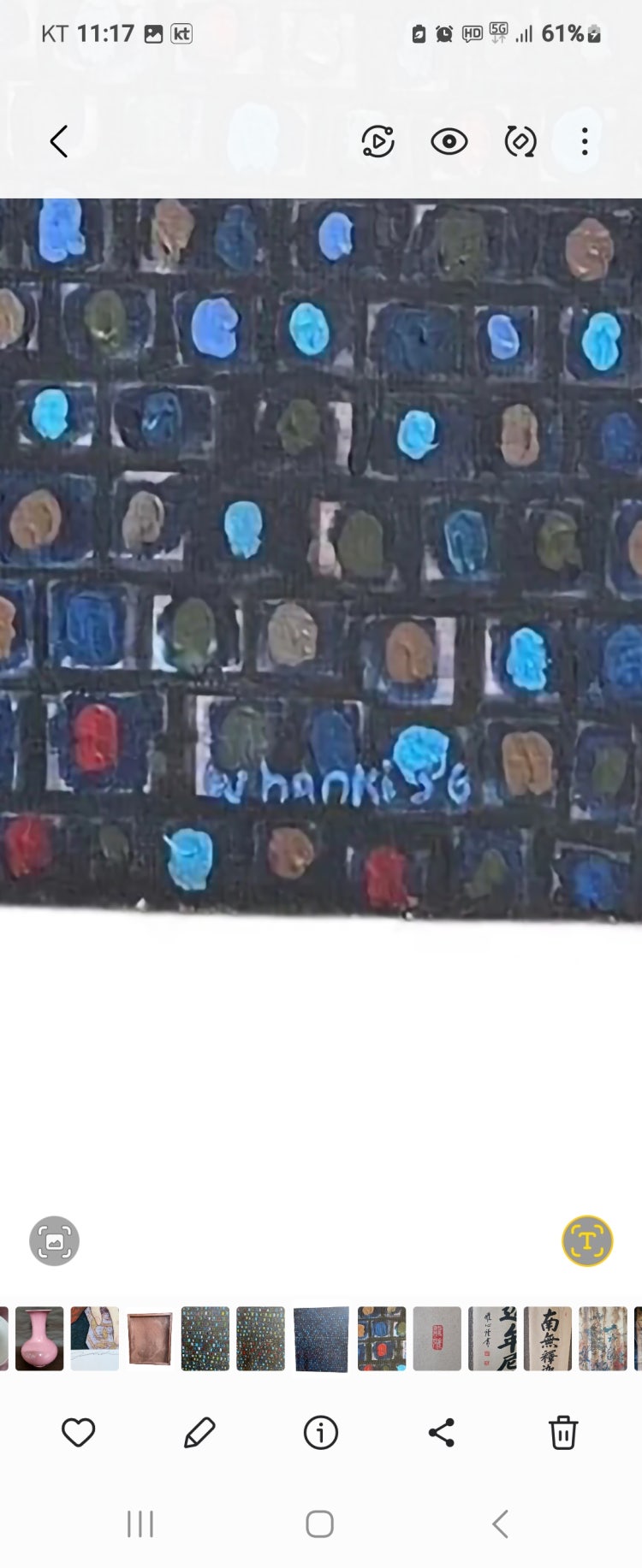 안녕하세요! 김환기 작가의 싸인을 확인하는 것은 중요한 부분입니다. 작품의 진위 여부를 판단하기 위해 몇 가지 방법이 있습니다 미술 감정가나 전문가에게 작품을 감정받는 것이 가장 확실한 방법입니다.이미 알려진 김환기 작가의 작품과 싸인을 비교해 보는 것도 도움이 될 수 있습니다.작품의 출처나 구입 경위를 확인해 보세요. 신뢰할 수 있는 갤러리나 경매에서 구매한 것이라면 더 믿을 수 있습니다. 작품과 함께 제공된 인증서나 감정서가 있다면, 그 내용을 확인해 보세요.