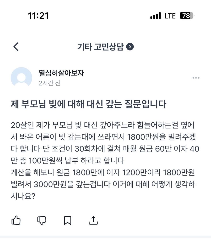 30회차라면 3년도 안 되는데 이차가 그렇게 높다면 법정이자율에 걸릴 수도 있습니다. 연 20%가 최대거든요. 그래서 연 20%를 초과하는 금액은 안 갚으셔도 됩니다. 부모님 빚은 질문자님이 꼭 갚아야 할 의무가 있는 것은 아니고요. 이미 천팔백을 그 사람한테 빌리신 건가요? 법률상담 카테고리에 다시 질문해보세요.