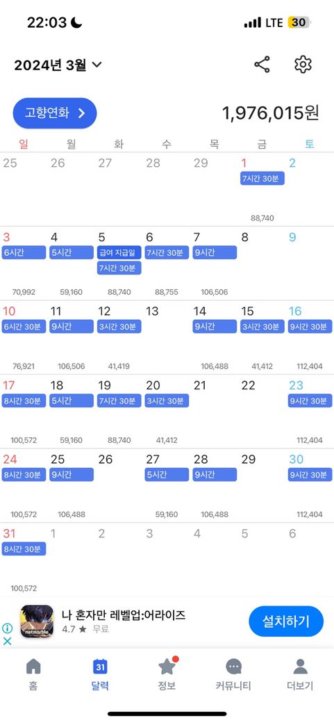 3월 5(마지막)주 41시간 근무 (23일 토요일 9.5시간)