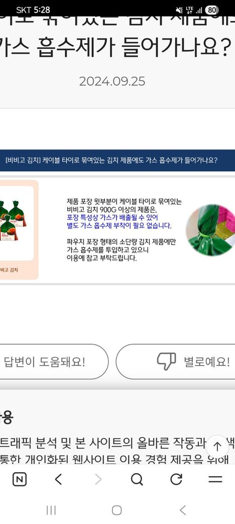 비비고 사이트에 비비고묵은지 900그람은 가스흡수제가 부착되지않는다고 하는데 맞나요?