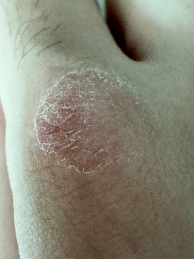 손에 사진과 같은 부분에서 어느날 갑자기 굳은살 같으면서도 갈라지면서 피가 난적도 있는데(지금은 피가 나지는 않음) 일주일 이상 지속되고 있어요 이게 어떤 문제일까요?