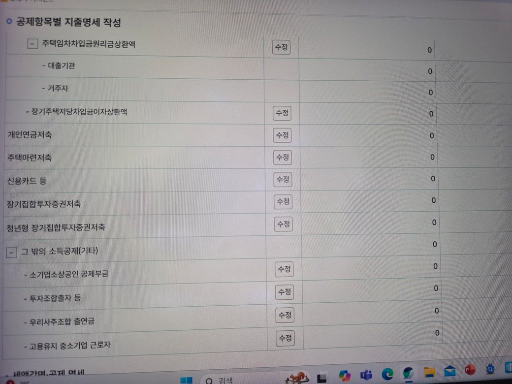 공제항목별 지출명세 작성에 다 0원으로 떠요.